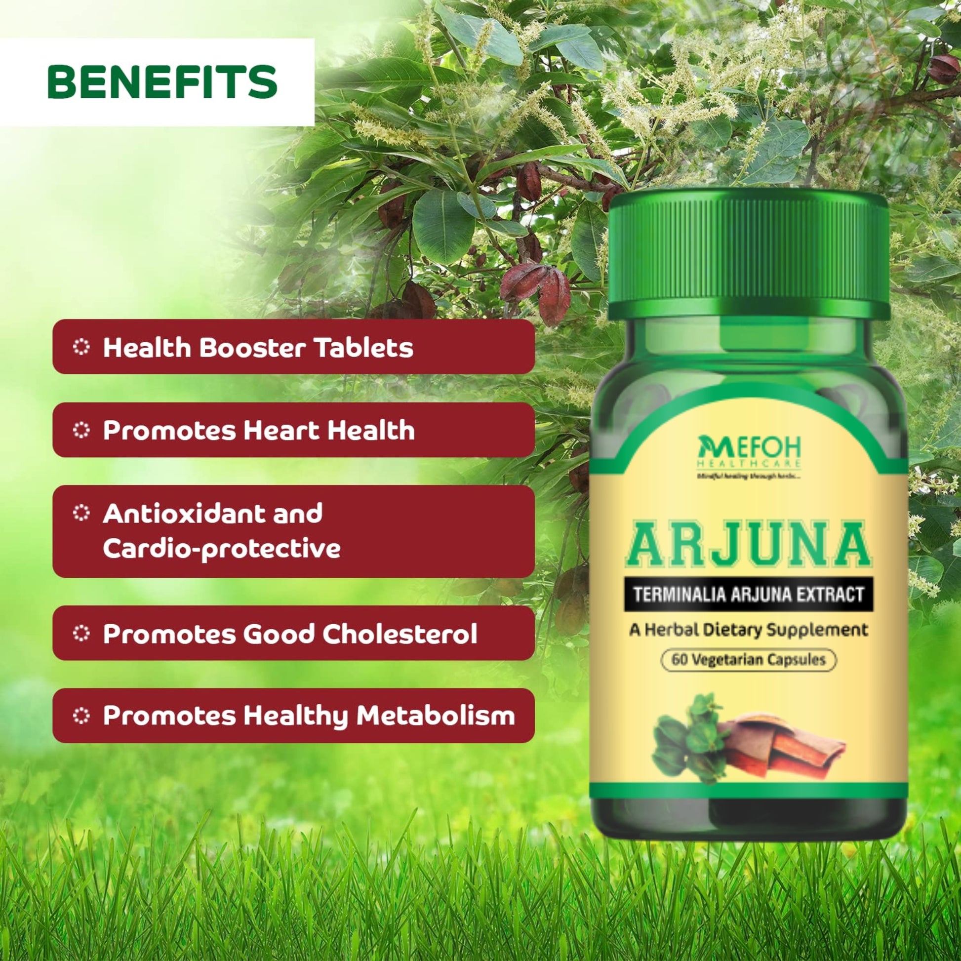 Mefoh Arjuna Capsules are formulated with pure Arjuna (Terminalia Arjuna) extract, a time-honored Ayurvedic herb known for its heart-protective, blood pressure-regulating, and cholesterol-balancing properties. Arjuna supports healthy circulation, strengthens heart muscles, and promotes overall cardiovascular wellness, making it an essential supplement for a healthy heart.