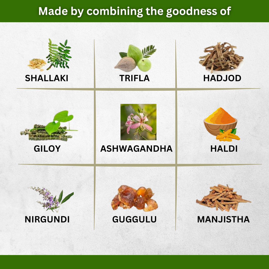 ORTHOMEF Capsules – A blend of anti-inflammatory and pain-relieving herbs like Shallaki, Guggul, Ashwagandha, and Rasna that work from within to reduce chronic joint pain, improve mobility, and support bone strength.